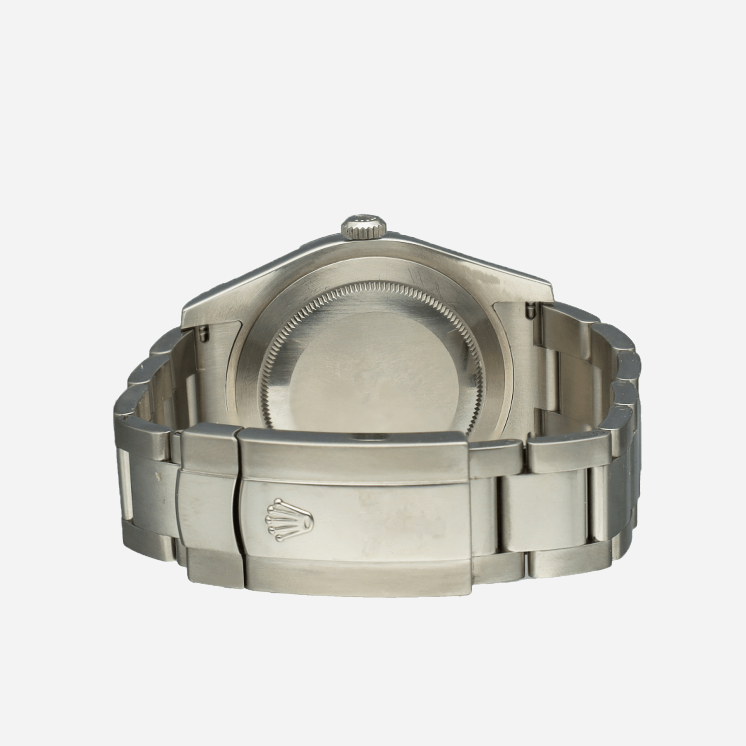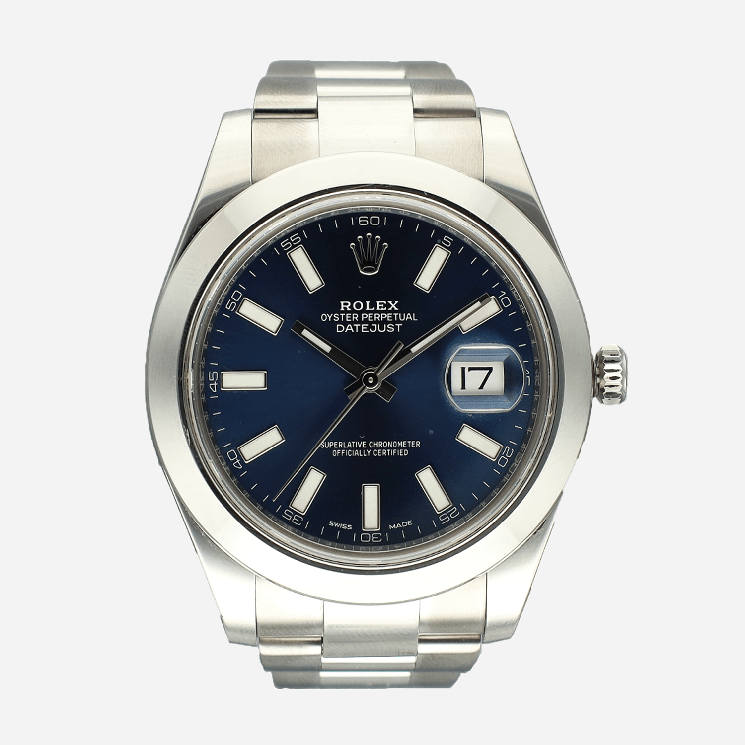Rolex Date-Just II Ref. 116300 de 2017 se encuentra en perfectas condiciones. El diámetro de la caja sin corona es de 41 mm, altura de la caja 12,1 mm, bisel de acero inoxidable liso y pulido. Esfera azul con índices aplicados y agujas en oro blanco, movimiento automático. Es una opción excelente para quienes buscan un reloj que combine elegancia, funcionalidad y una reputación icónica en el mundo de la relojería. Ideal tanto para ocasiones formales como para el uso diario, su diseño atemporal se asegurará de que siempre luzcas sofisticado.
