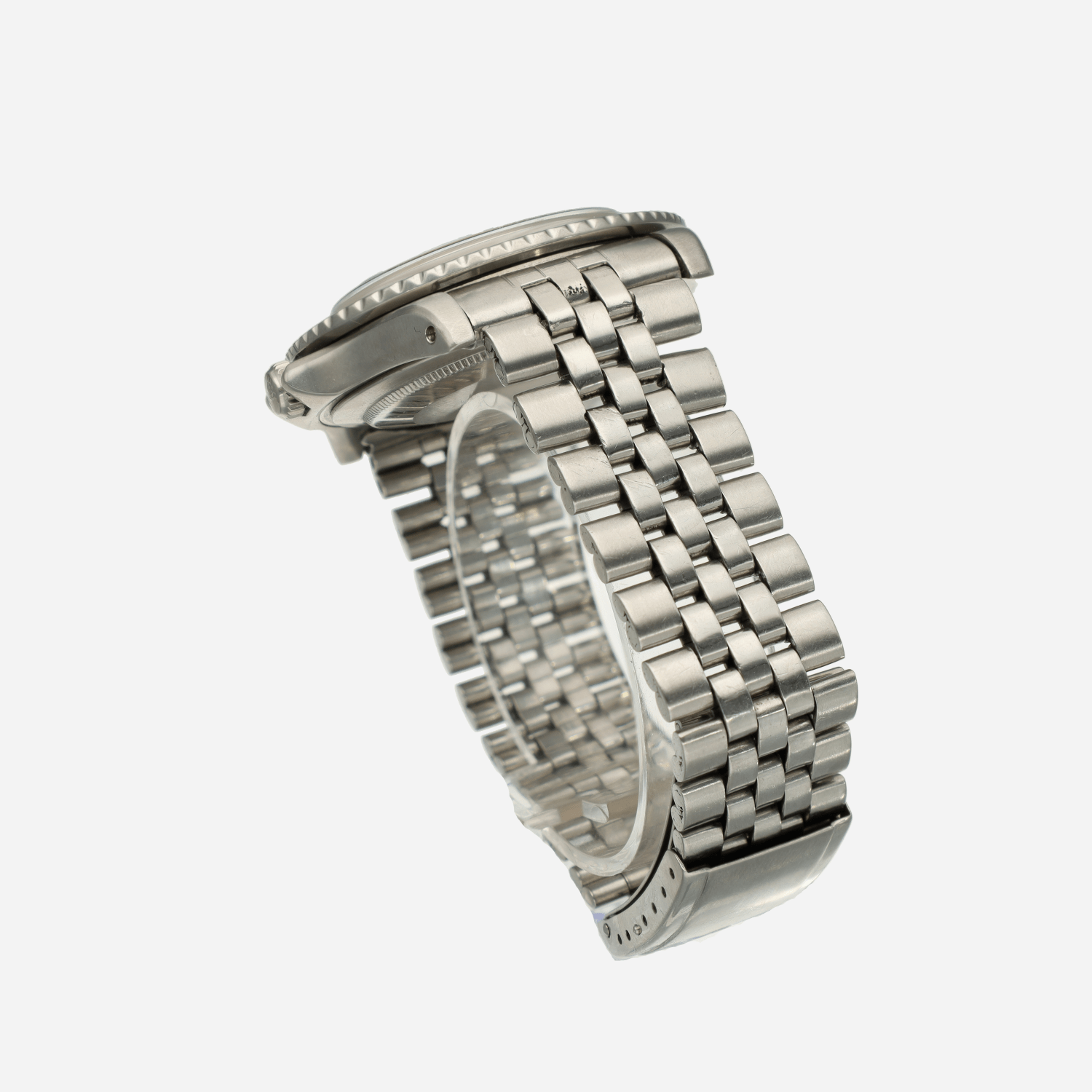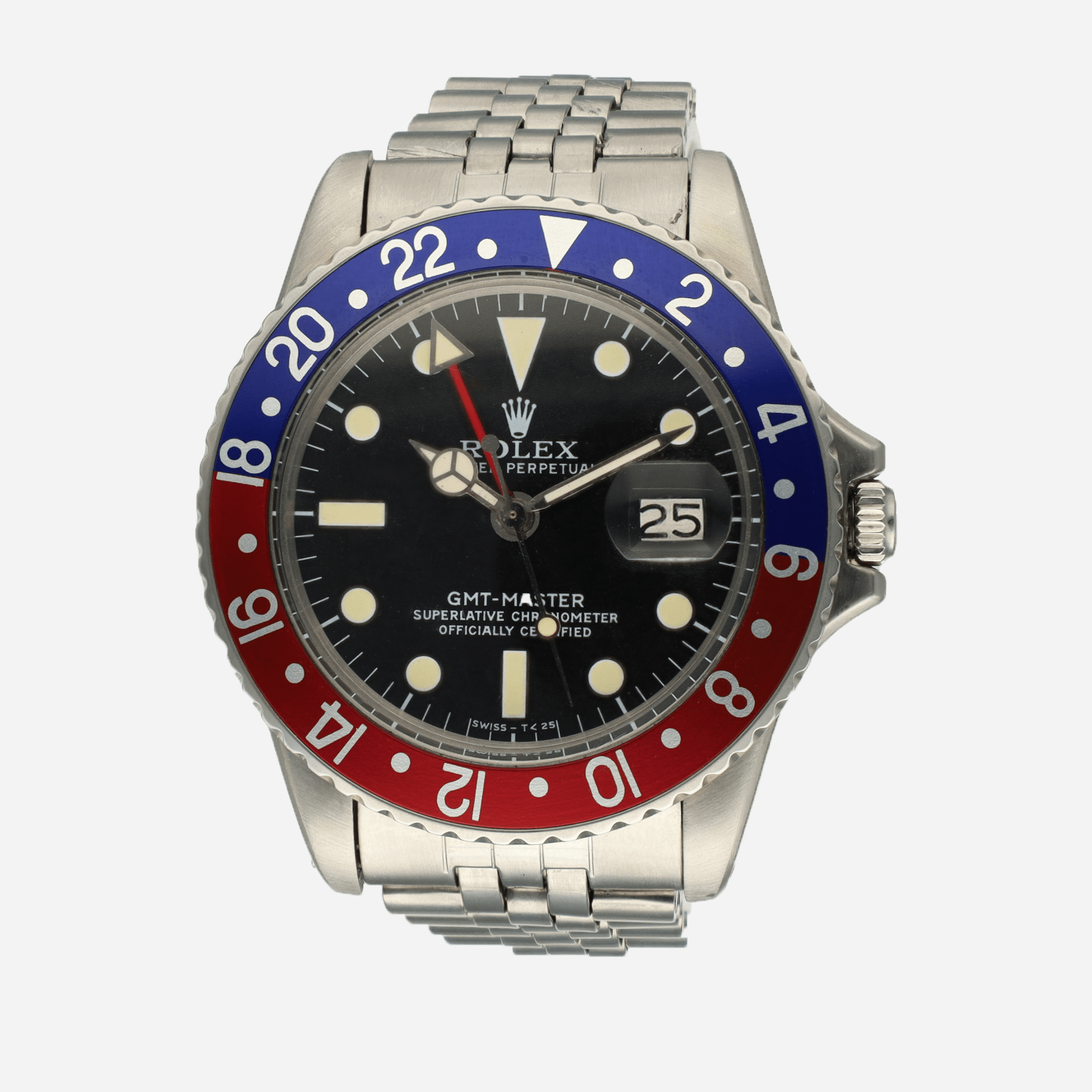 Rolex GMT-Master Ref. 1675 de 1982 es un reloj en excelentes condiciones que combina estilo clásico con funcionalidad moderna. Su caja y correa Jubilee, ambas fabricadas en acero inoxidable, ofrecen un ajuste cómodo y elegante. Este modelo cuenta con una icónica esfera negra y el famoso bisel bicolor rojo y azul «Pepsi», que permite la visualización de dos husos horarios simultáneamente.